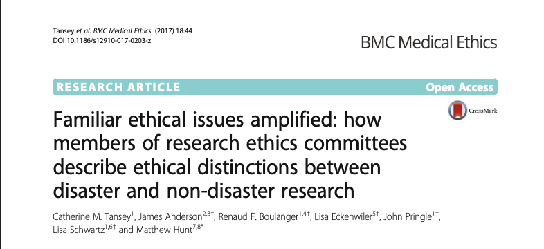 Results of a study presenting how REC members who had reviewed disaster research protocols perceived ethical issues by Tansey et al.